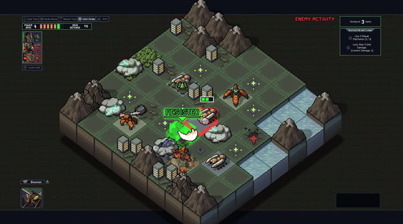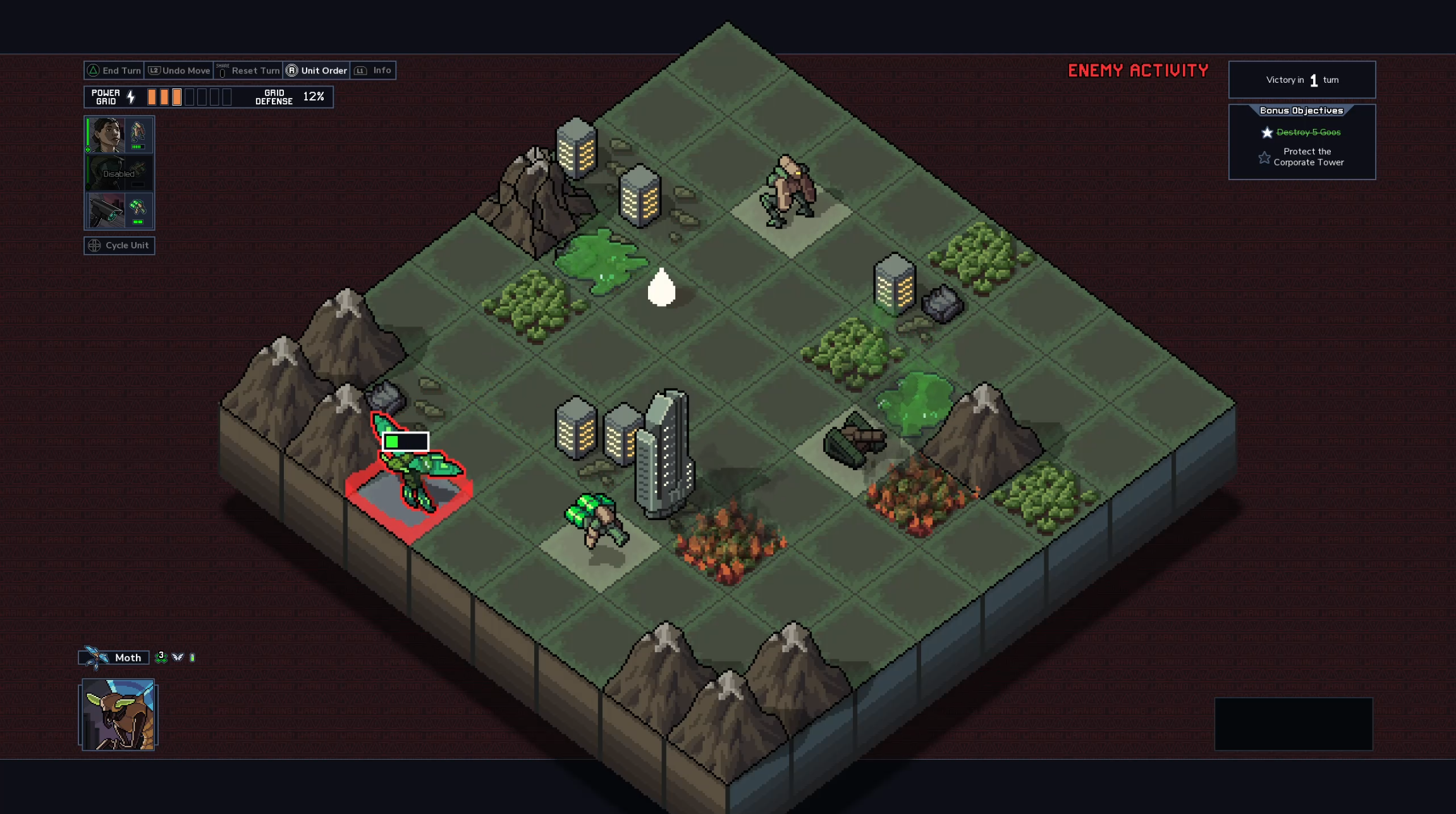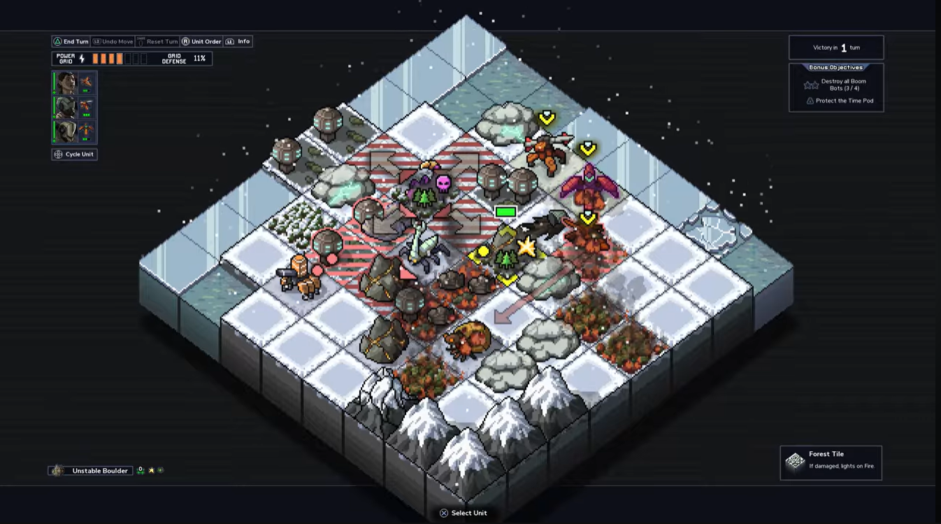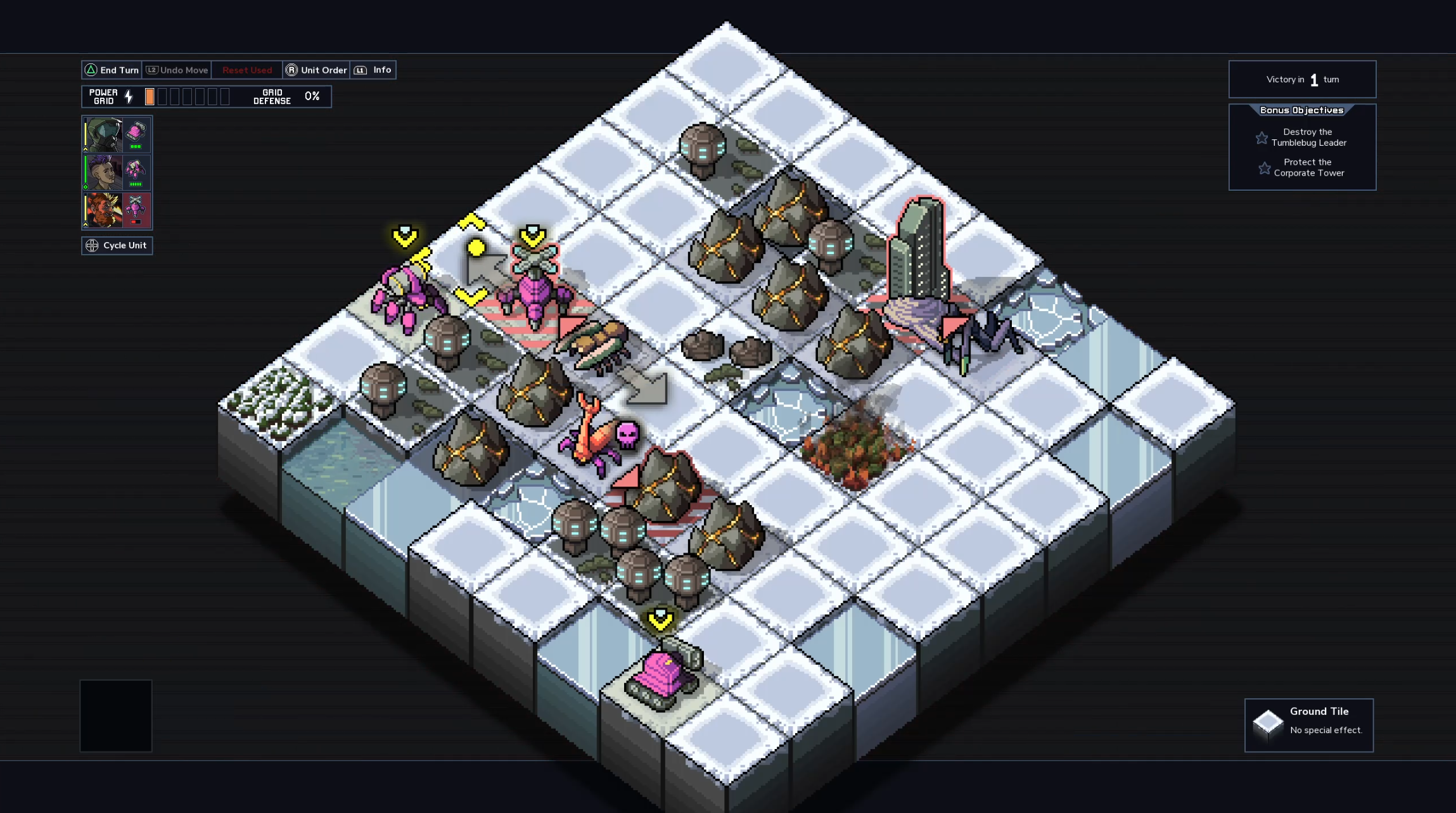 Into the Breach is my ultimate turn-based tactics game. It's no doubt a roguelike in its campaign structure but it's the turn-by-turn mini-puzzles that are the star of the show and keep me coming back year after year. Part of the appeal to these puzzles is that finding the best possible solution isn't as straight forward as one might expect, especially when compared to traditional puzzle games. Into the Breach asks the player to balance grid power, mech health, killing vek, and bonus objectives (which on higher difficulties are not really optional). While this is quite a few things to juggle, the actual battles themselves are very contained in scope. With just three mech under your control and the map being an 8x8 grid, the entire battlefield is at your fingertips. A shared trait with FTL (Subset’s previous game) is their easily digestible UI. Minimal menus and a clean visual design mean everything the player needs to know is right in front of them. This GDC talk by Matthew Davis, one half of Subset Games, is fascinating and digs into a lot of these topics. I highly recommend a watch if you're into game design at all.