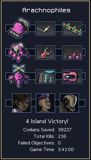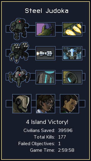 Our first win of the playthrough! And a solid final score too. I know I can do better, but it's good to get one in the victory column. Overall, Cataclysm felt really strong throughout this run. The pilots really carried the show for the first four island, Camila, Prospero, and Morgan is a nice lineup with good versatility. The final battle was carried by the weapons however as we ended with an AI pilot. The choice of who to save could've been tough, but Prospero rolled Invulnerable and Thick Skin, so it was a fairly easy choice to with our hugely skilled Camila.