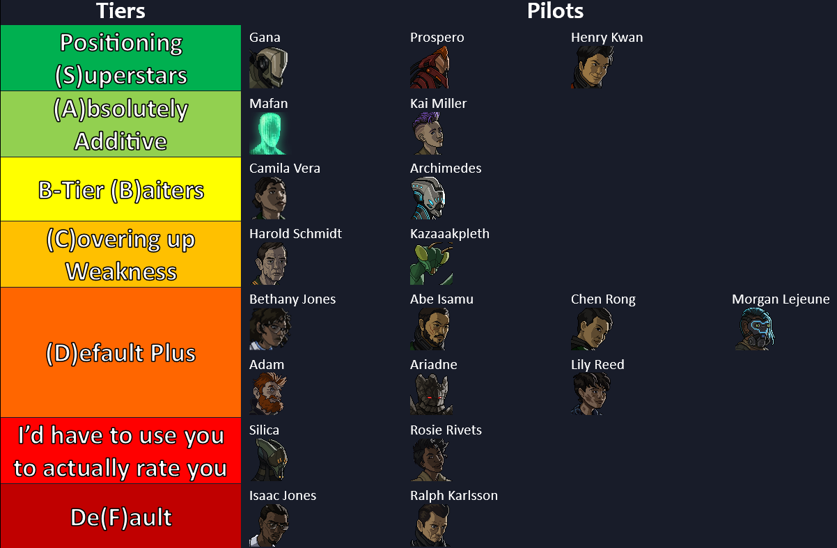 Unlike the squad tier list, I think the pilots are little easier to rate because they can have some very tangible impacts on the outcome of a run. The abilities they acquire with level-ups mid-run are very impactful too, but some of these special abilities pilots have are game changers.