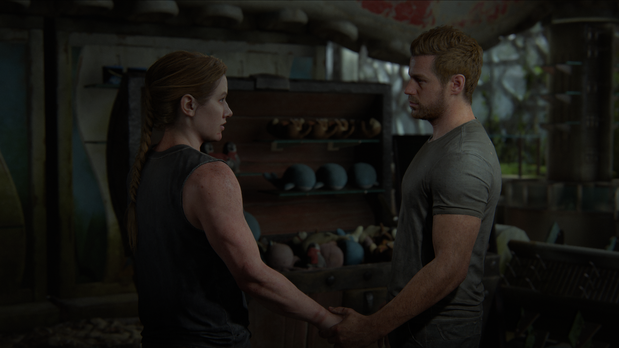 When Ellie gets to where she thinks Abby is at the end of Day 3, again, there is no sign of her. But guess what, there's two more of her friends who Ellie proceeds to murder. It is what it is, Ellie is in a fucked up place at this point panicking most likely at what she's become and no closer to finding Abby. Luckily Jesse and Tommy show up to pull her out of her panic attack and regroup back at the theater. Ellie awakes the next day to Tommy yelling in the lobby. She rushes out with Jesse only for Jesse to immediately get shot and killed by Abby, who is holding Tommy at gunpoint. Ellie ducks out of the way, but by threatening to kill Tommy, Abby forces Ellie to come out and face her.